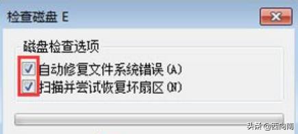 2、在弹出的“检查磁盘”对话框中同时选中“自动修复文件系统错误”和“扫描并尝试恢复坏扇区”两项,点击“开始”执行修复操作。