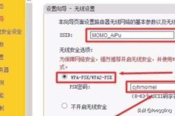 第五步,接下来会出现无线网参数设置的界面,这里“SSID”是我们设置的无线账号的名称,安全选项里是密码的设定,按照自己的想法设定好参数,然后点击“下一步”。