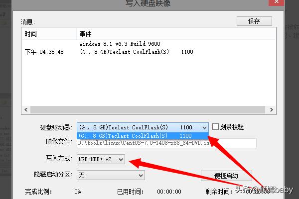 6.选择你的U盘选择写入方式为USB-HDD+V2