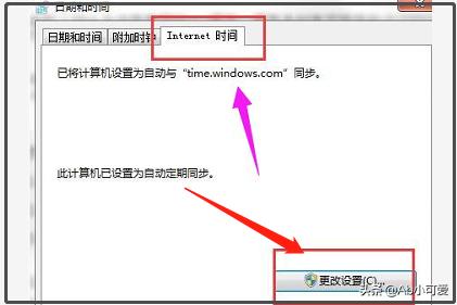 2、在窗口中,选择internet时间,点击更改设置,方法如下。