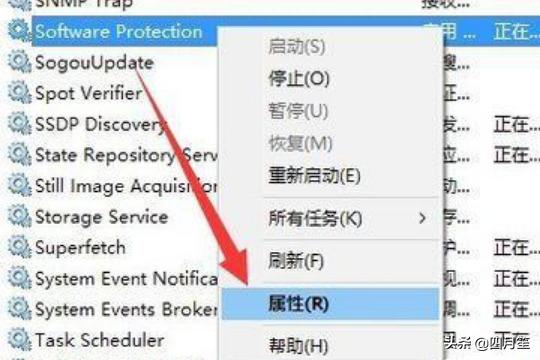 5、此外,为了防止以后再次发生此类“无法验证此产品的许可证”的问题,我们需要执行以下操作:右击“Software Protection”服务项,从其右键菜单中选择“属性”项。