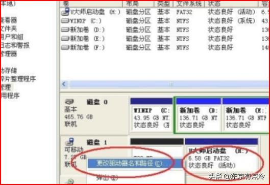 5、单击“磁盘管理”,在窗口右侧,看到U盘运行状态为“良好”,说明U盘没问题。右点U盘盘符,选“更改驱动器名和路径”,为其选择一个未被使用的盘符。